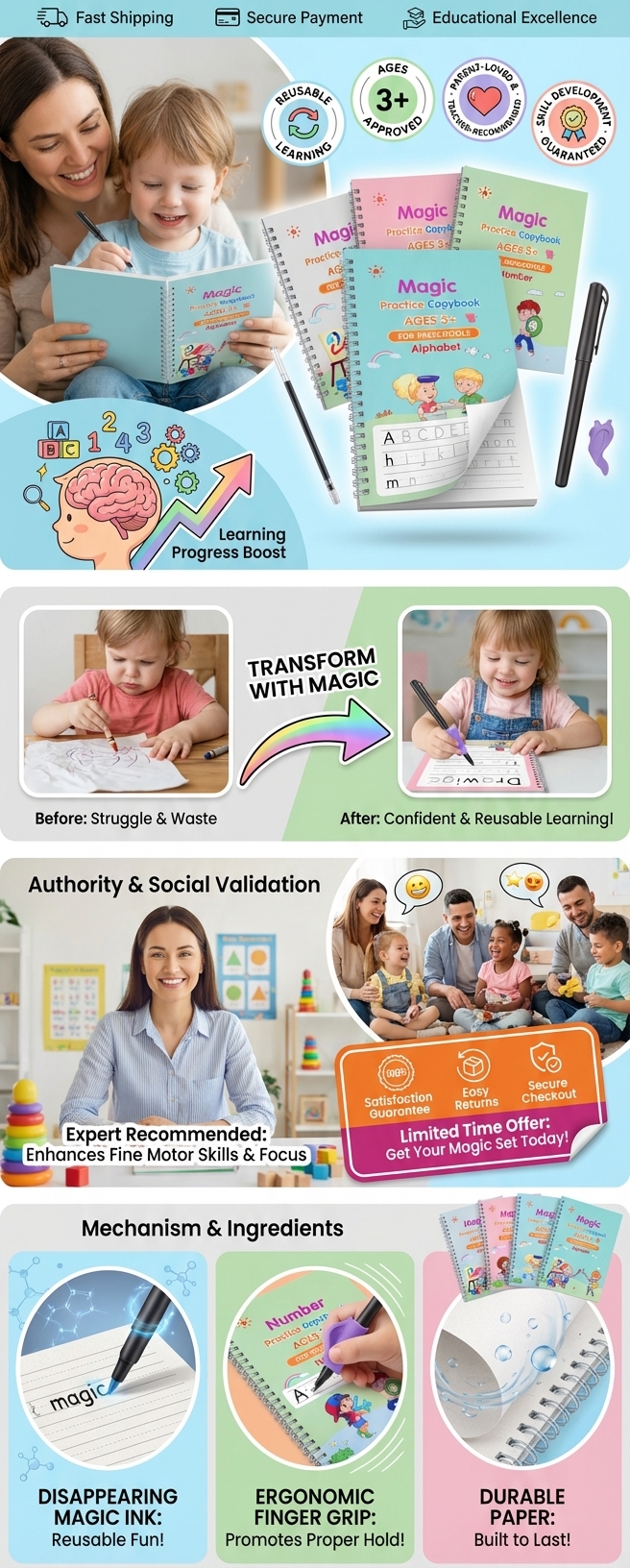 • Package Includes: Set of 4 Magic Books + 1 Magic Pen with 10 Refills + 1 Grip